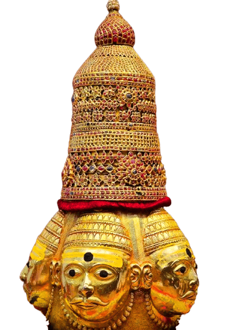 The Trimbakeshwar linga is covered by a jeweled crown (crown consists of diamonds, precious stones) placed over a tridev gold mask. That jeweled crown is said to be a crown from the age of Pandavas.